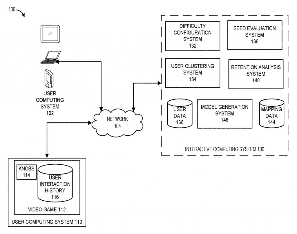 U.S. Patent No. 10,286,323 (the ‘323 Patent) relates to level of difficulty in video games. Games that are too easy or too difficult will result in less enjoyment for a user which will lead to less playtime. A challenge for game developers is designing a game difficulty levels that are more likely to keep users engaged for longer periods of time. Based on user data and monitoring the user against the expected results the video game may modify the difficulty level by selecting a seed value to change the level accordingly. A prediction model may be generated using machine learning as well to affect the difficulty level. The computer processor will continue to monitor progress and can continuously alter the video game to make these changes. This process can then further increase engagement with the video game.
