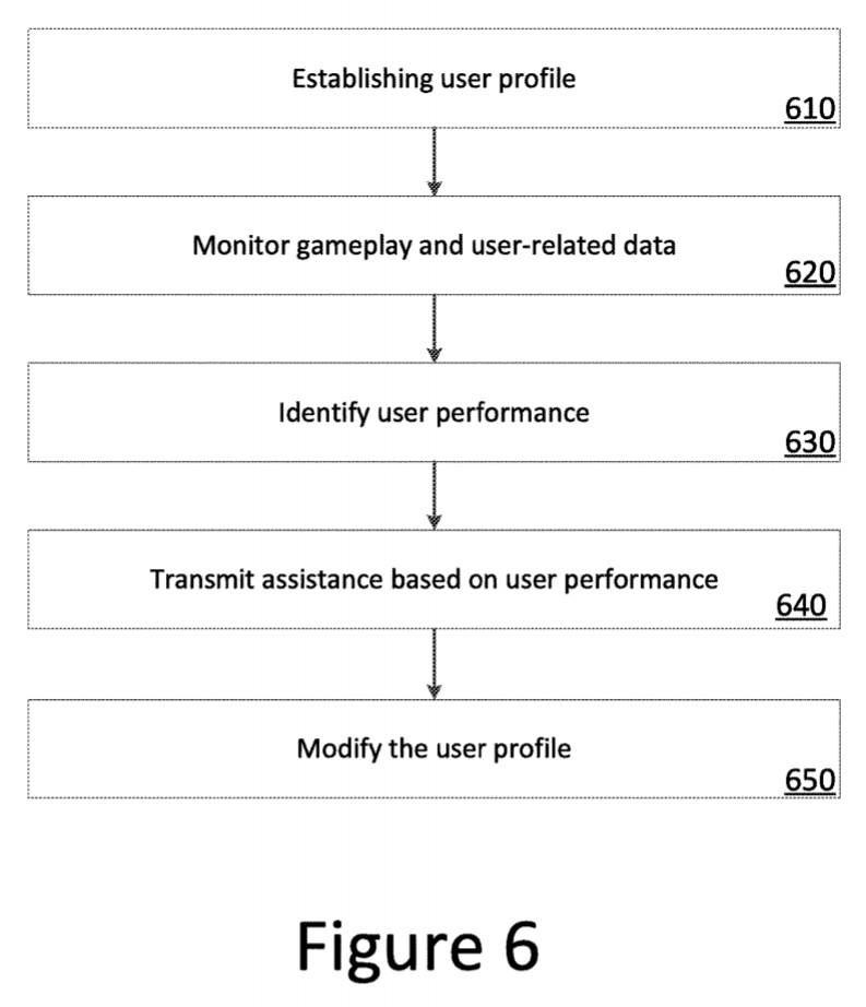 U.S. Patent No. 10,427,047 (the ’047 Patent) relates to identifying where and when a video game player is struggling and providing the player with assistance. The ’047 Patent details a system that obtains user gameplay information to analyze the player’s performance to determine if the player is struggling with an event, obstacle, challenge, etc., and provide assistance information to help the player progress in the game. The user may set preferences for performance thresholds for when they want to be given assistance, as well as preferences for the type or extent of assistance information. For example, hints may be given if a player’s frustration level meets the threshold for hints, and if the player’s performance indicates a further increase in frustration, more detailed assistance may be provided to help the player overcome the event, obstacle, challenge, etc. The threshold assistance information may be determined based on how the user’s performance compares to that of other players who faced the same event, obstacle, challenge, etc.