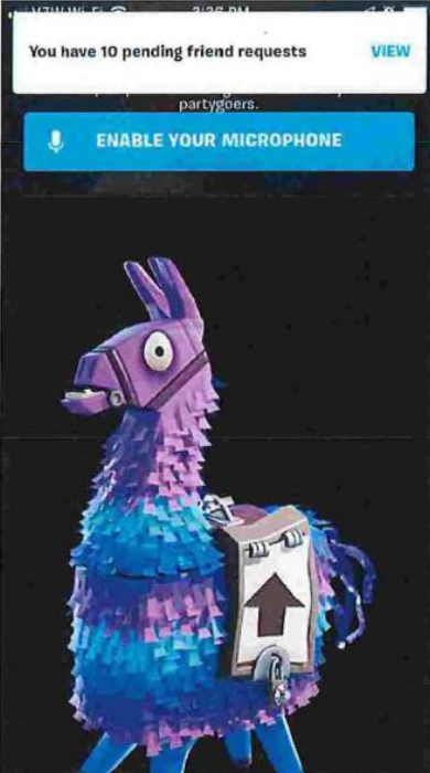 Epic applied to register the Llama Mark in December of 2018. As shown above, the Llama Mark consists of “a fanciful cartoonish image of a llama with the design of a treasure chest on the side portion of its saddle.” The application covered International Class 9 for “video game software” (as amended – the original goods description included cell phone stands as well), and International Class 41 for “entertainment services, namely, providing online video games.” The Llama Mark image has been featured in Epic’s game, Fortnite, as a loot-giving llama since March 2018.