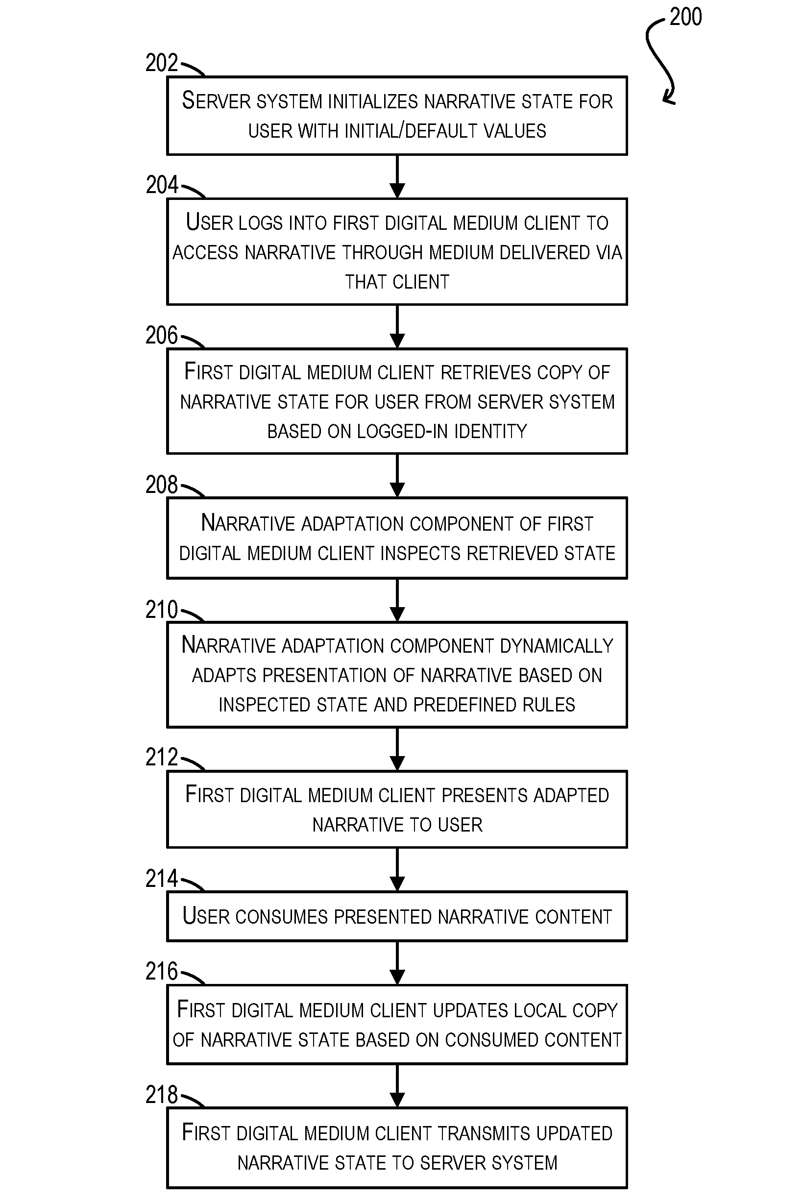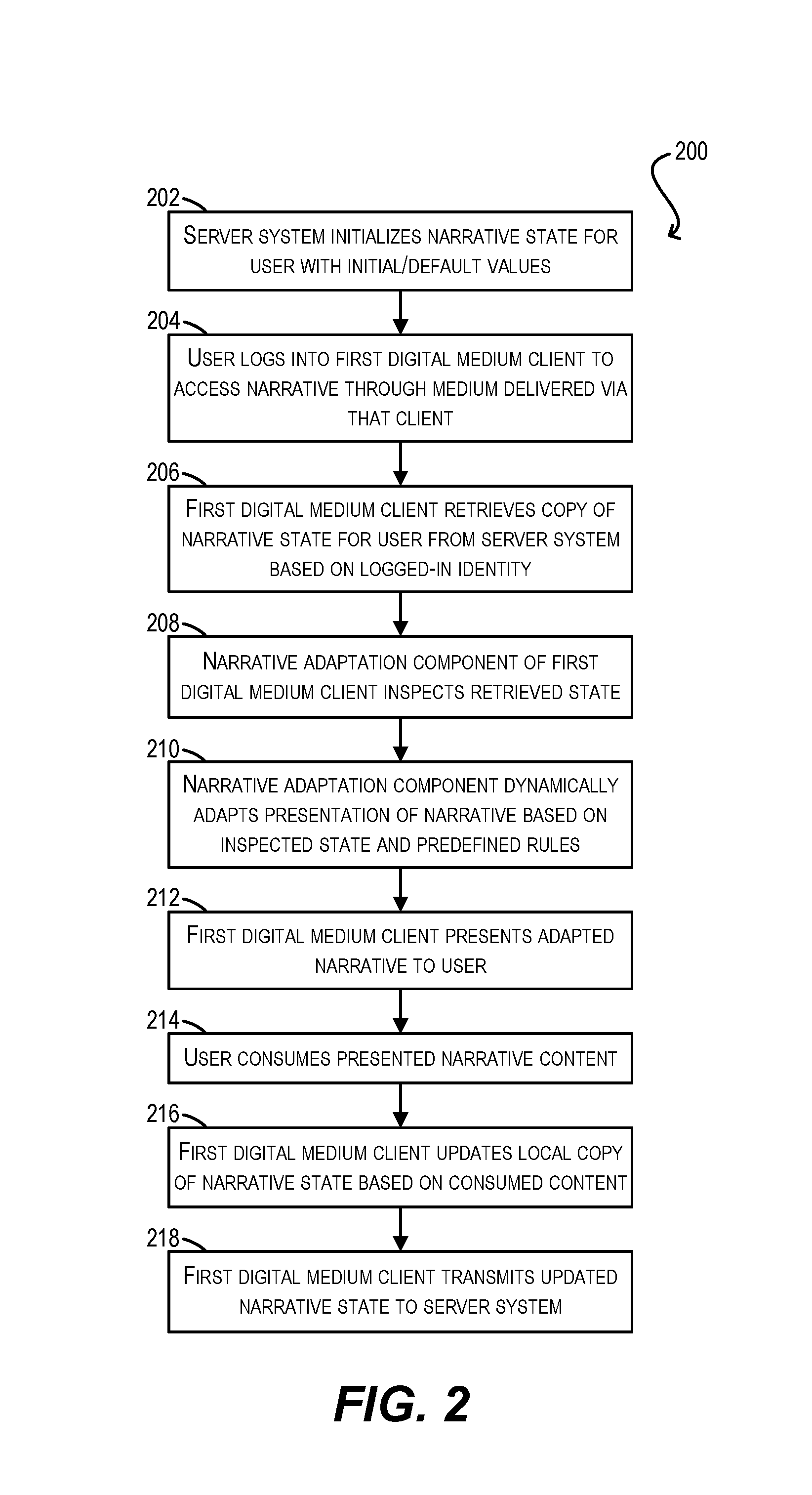 - A method comprising: maintaining, at a server system, a narrative state for a narrative to be presented to a user across a plurality of digital media; and in response to determining that the user has logged into a first client system, transmitting, by the server system, a copy of the narrative state to the first client system, wherein the first client system is configured to present the narrative to the user via a first digital medium in the plurality of digital media, and wherein upon receiving the copy of the narrative state, the first client system is configured to: adapt, based on the copy of the narrative state and one or more first rules, the first client system’s presentation of the narrative to the user via the first digital medium, wherein the adapting takes into account information included in the copy of the narrative state that identifies portions of the narrative which have already been consumed by the user while operating a second client system different from the first client system, the second client system being configured to present the narrative via a second digital medium different from the first digital medium; update the copy of the narrative state based on portions of the narrative consumed by the user via the first client system; and upon determining that the user has logged out of the first client system, transmit the updated copy of the narrative state to the server system for storage on the server system.