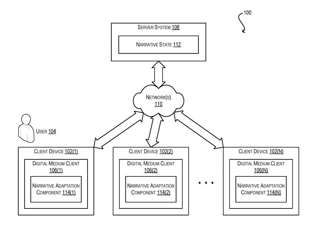 U.S. Patent No. 10,140,271 (the ‘271 patent) relates to the dynamic adaption of presentation of digital storytelling, maintaining progress over various devices and types of digital media. The ‘271 patent could allow users to engage in a given narrative via a variety of digital media and resume progress on another device later. The ‘271 patent details a method in which a server system maintains a narrative state to be presented to a user. When it is determined that the user logs into a first client system, a copy of the narrative state is transmitted to the first client system. The first client system adapts the presentation of the narrative to the user; adapting accounts for the digital medium, information included in the copy of the narrative state, and portions of the narrative which have already been consumed on another client system by the user. Upon determination of a client logout, an updated copy of the narrative state is transmitted to the server system. This updates the narrative state so it is accessible next time the user wants to play, on whichever device.