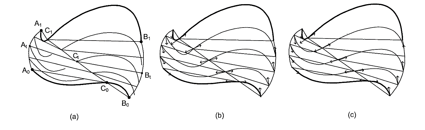 - In a computer-assisted animation system, a method for generating inbetween frames, wherein an inbetween frame is an image within an animation sequence that is to be displayed in sequence between two key frames drawn by an artist, and wherein the inbetween frames are to be initially at least partly computer generated, the method comprising: receiving a set of at least two key frames, including a first key frame that is to precede an inbetween frame set comprising at least one generated inbetween frame in the animation sequence, and a second key frame that is to follow the inbetween frame set in the animation sequence; analyzing elements of the set of key frames to identify strokes in images that are represented by the set of key frames, wherein a stroke is an image feature that is representable, in part, by a continuous curve segment with endpoints and zero or more additional sample points on the curve segment that has an associated thickness, wherein a result of analyzing is a generation of a stored list of strokes; determining corresponding stroke pairs, a stroke pair comprising the first stroke of a first key frame of the set of key frames and a second stroke of the second key frame of the set of key frames; for each of a plurality of the corresponding stroke pairs, computing a continuous stroke motion for moving the endpoints of the first stroke of the stroke pair in the first key frame to a position of the endpoints of the second stroke in the second key frame, wherein the continuous stroke motion is defined by motions of the endpoints of the first stroke and the endpoints of the second stroke; for each of a plurality of mutual endpoints, wherein a mutual endpoint is an endpoint of two or more strokes in the first key frame and/or second key frame that form meeting strokes, adjusting the continuous stroke motion of the meeting strokes such that the adjustment results in the continuous stroke motion coinciding, or at least coinciding within a margin of error, at the mutual endpoint such that the mutual endpoint would follow the same path, within a margin of error, regardless of which of the mutual endpoint’s stroke’s continuous stroke motion is used; determining an animation time for a desired inbetween frame relative to the animation times of the first key frame and the second key frame; determining a location of endpoints given the animation time of the desired inbetween frame and continuous stroke motion; automatically generating strokes of the desired inbetween frame from at least the determined endpoint locations; and storing the automatically generated strokes in a form that allows for later electronic editing of the desired inbetween frame.