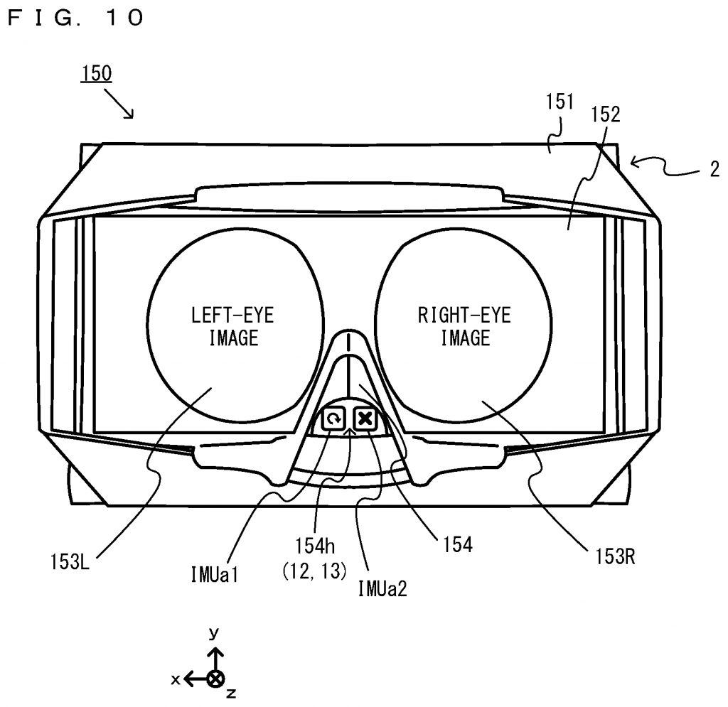 To achieve VR, a left eye image is displayed in the first area of the touch screen, a right eye image having parallax with the left eye image is displayed in the second touch screen area. If the third area is touched, the information processing apparatus executes a process. This allows the goggles to be used for VR with the information processing apparatus, the third section allowing a user to exit the VR mode of the display. The ‘142 patent is likely one of several patents relating to an aspect of the Nintendo LABO, particularly the virtual reality goggles one can build with the kit.