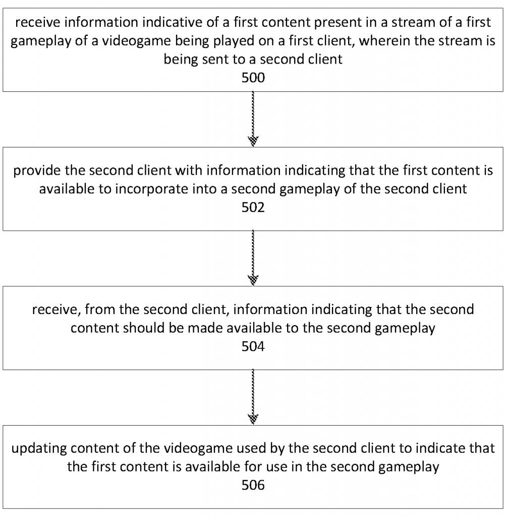 U.S. Patent No. 10,987,595 (the ‘595 patent) relates to identifying content in a video game stream and providing indication to a viewer as to where that content is available. The ‘595 patent details a system which receives a video stream of video game gameplay, and sends that stream along with availability information of identified content to a viewer. As it receives the video stream, it identifies content of the gameplay in the stream sent to the second client device. Content is identified from a first frame of several and the system indicates that the content is included in the first frame. In response to identification, the second client device is sent information indicating the first content is available to the viewer for incorporation into their own gameplay. The indication information is received and the system updates the content accessible to the second client device to enable the viewer to use the first content in the viewers own gameplay. The ‘595 patent could facilitate viewers of video game streams discovering and acquiring game content, directly within the stream they were already watching.