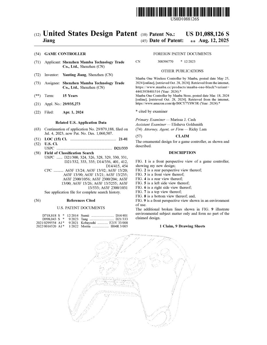 U.S. Design Pat. No. D1,088,126 U.S. Pat. App. No. 29/935,273 GAME CONTROLLER Shenzhen Mamba Technology Trade Co., Ltd. April 1, 2024