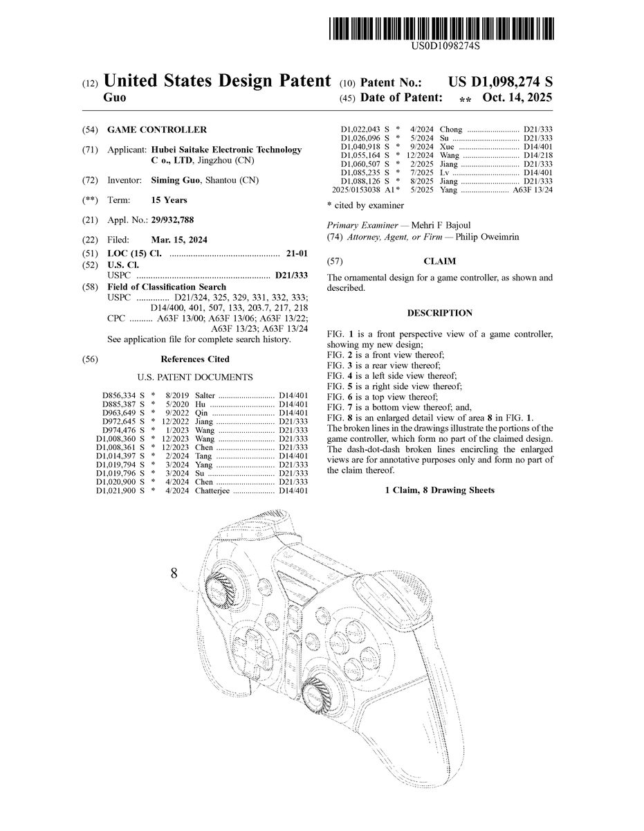 U.S. Design Pat. No. D1,098,274 U.S. Pat. App. No. 29/932,788 Game Controller Unknown assignee March 15, 2024