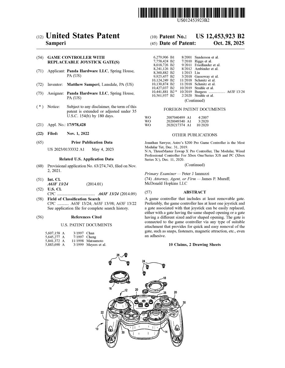 U.S. Pat. No. 12,453,923 U.S. Pat. App. No. 17/978,428 GAME CONTROLLER WITH REPLACEABLE JOYSTICK GATE(S) Panda Hardware LLC November 1, 2022