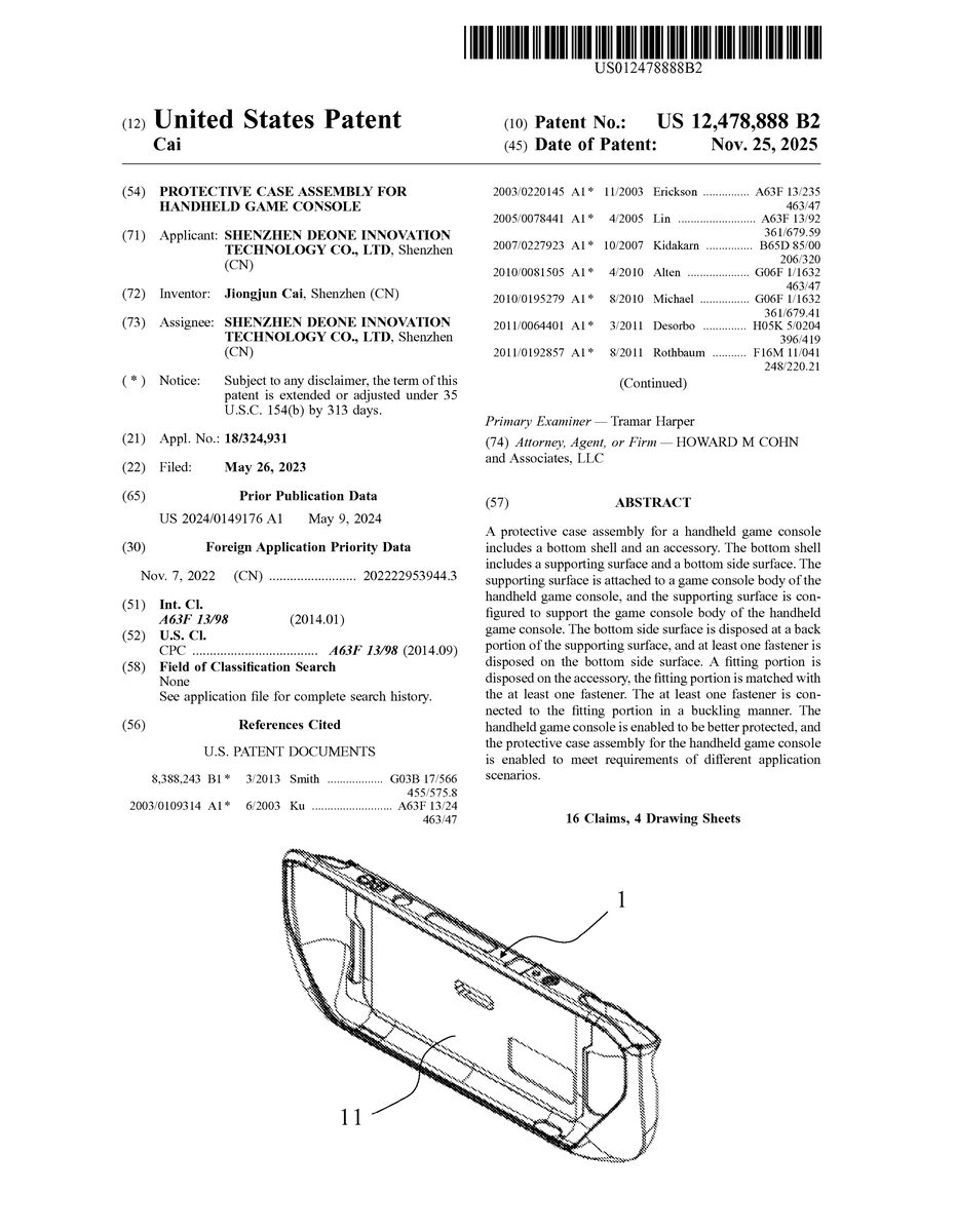 U.S. Pat. No. 12,478,888 U.S. Pat. App. No. 18/324,931 PROTECTIVE CASE ASSEMBLY FOR HANDHELD GAME CONSOLE SHENZHEN DEONE INNOVATION TECHNOLOGY CO., LTD May 26, 2023