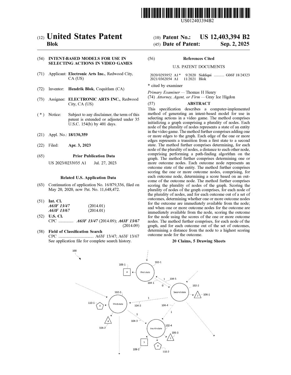 U.S. Pat. No. 12,403,394 U.S. Pat. App. No. 18/130,359 Intent-based Models for Use in Selecting Actions in Video Games ELECTRONIC ARTS INC. April 3, 2023