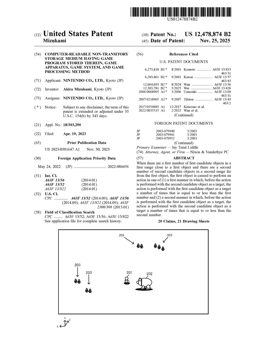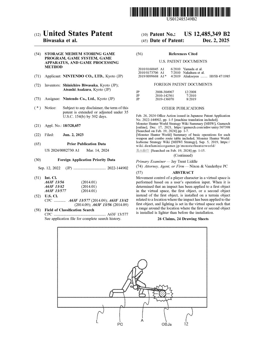 U.S. Pat. No. 12,485,349 U.S. Pat. App. No. 18/328,657 STORAGE MEDIUM STORING GAME PROGRAM, GAME SYSTEM, GAME APPARATUS, AND GAME PROCESSING METHOD Nintendo Co., Ltd. June 2, 2023