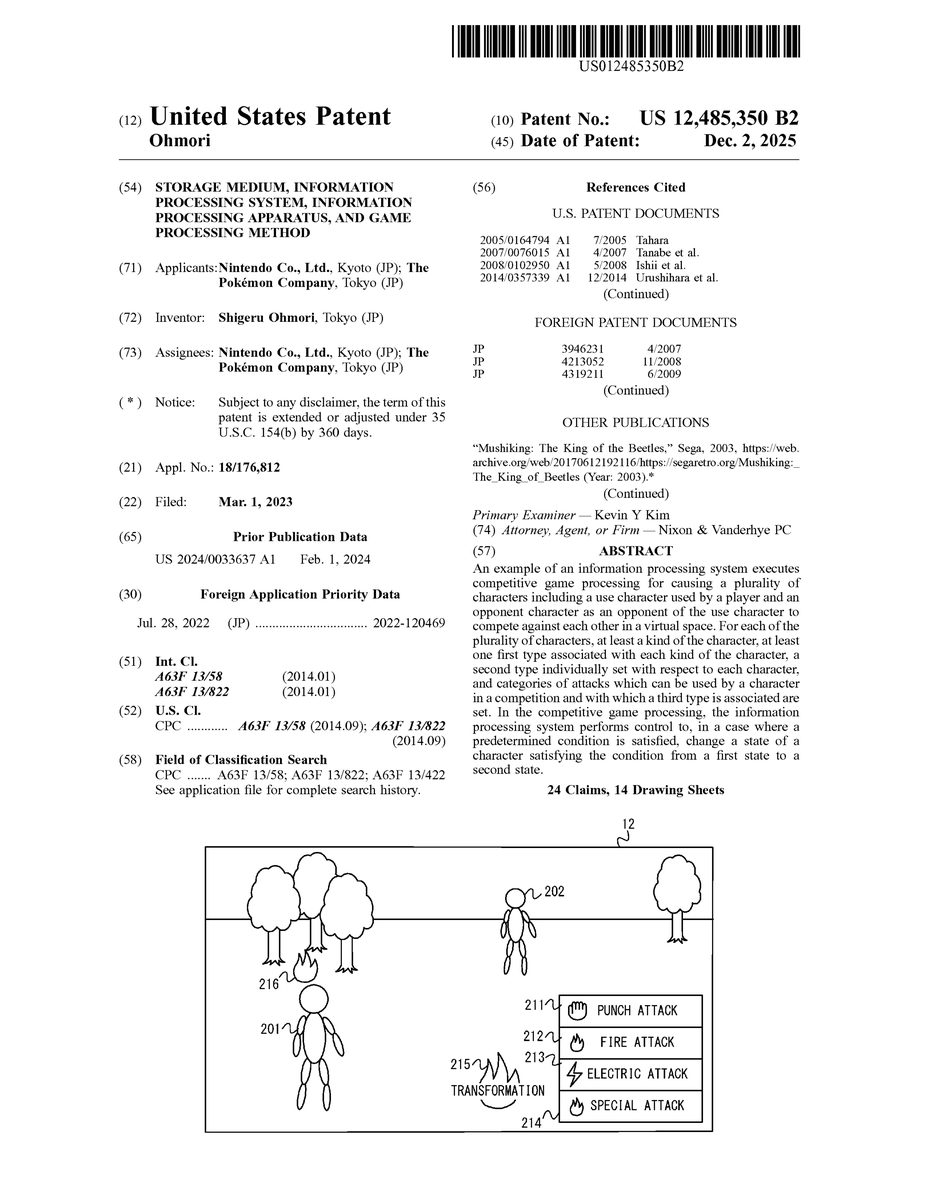 U.S. Pat. No. 12,485,350 U.S. Pat. App. No. 18/176,812 STORAGE MEDIUM, INFORMATION PROCESSING SYSTEM, INFORMATION PROCESSING APPARATUS, AND GAME PROCESSING METHOD Nintendo Co., Ltd.; The Pokémon Company March 1, 2023