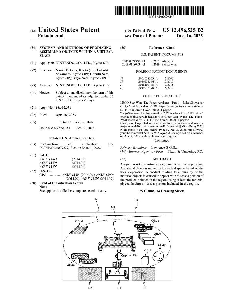 U.S. Pat. No. 12,496,525 U.S. Pat. App. No. 18/302,336 SYSTEMS AND METHODS OF PRODUCING ASSEMBLED OBJECTS WITHIN A VIRTUAL SPACE NINTENDO CO., LTD. April 18, 2023