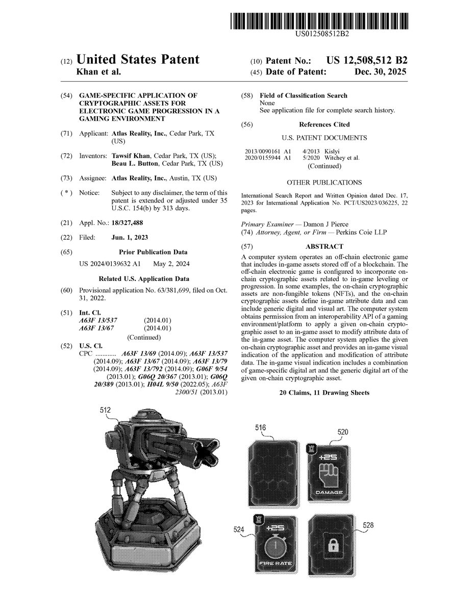 U.S. Pat. No. 12,508,512 U.S. Pat. App. No. 18/327,488 GAME-SPECIFIC APPLICATION OF CRYPTOGRAPHIC ASSETS FOR ELECTRONIC GAME PROGRESSION IN A GAMING ENVIRONMENT Atlas Reality Inc June 1, 2023