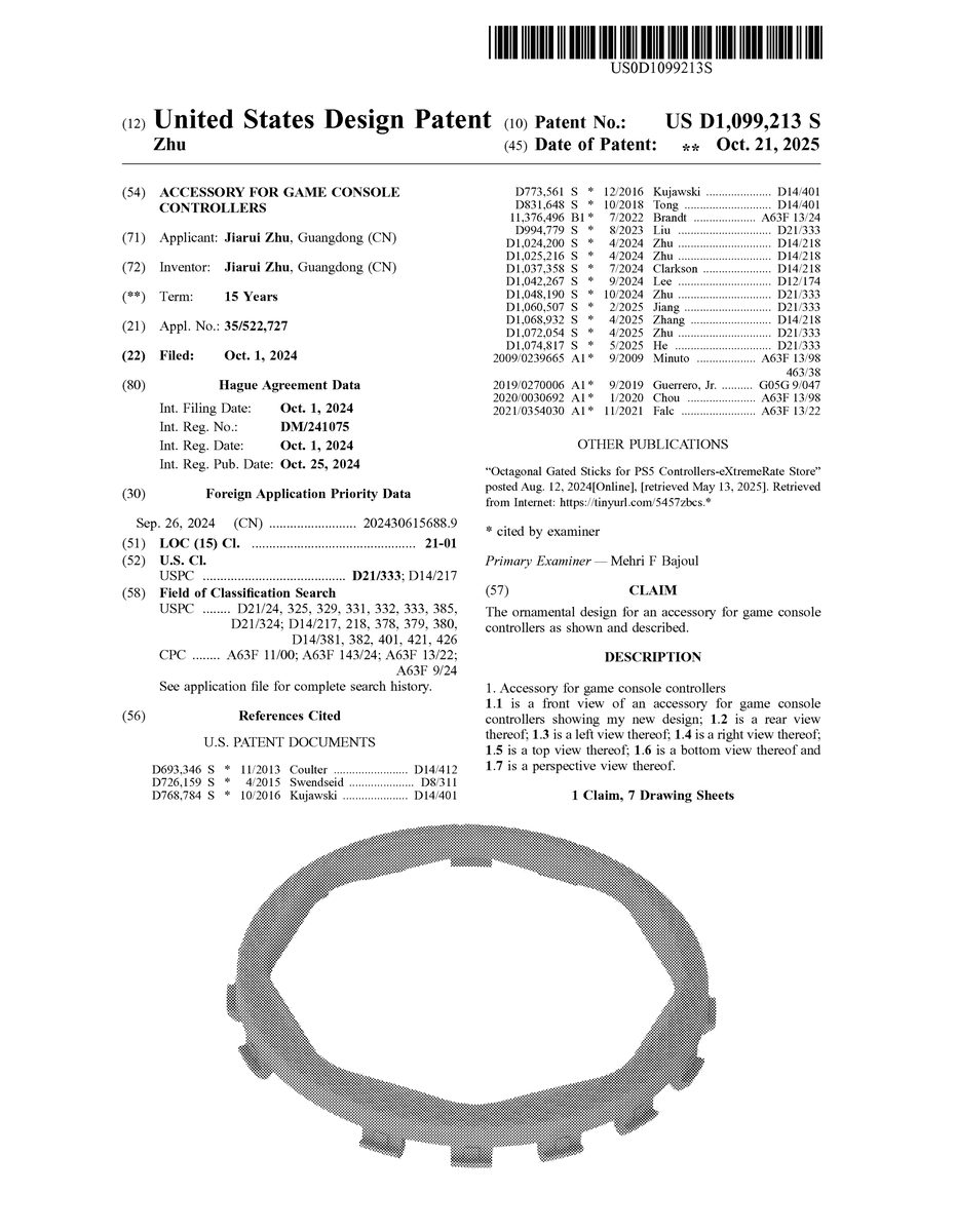 U.S. Design Pat. No. D1,099,213 U.S. Pat. App. No. 35/522,727 Accessory for Game Console Controllers Unknown assignee October 1, 2024