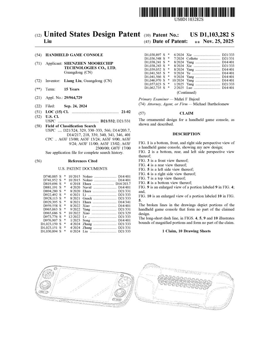 U.S. Design Pat. No. D1,103,282 U.S. Pat. App. No. 29/964,729 Handheld game console Unknown assignee September 24, 2024