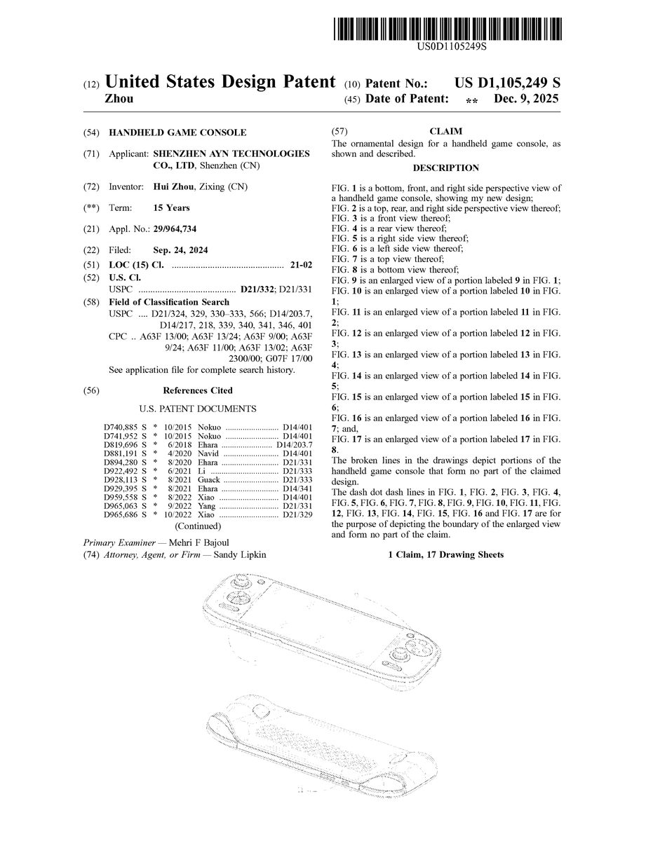 U.S. Design Pat. No. D1,105,249 U.S. Pat. App. No. 29/964,734 Handheld game console Unknown assignee September 24, 2024