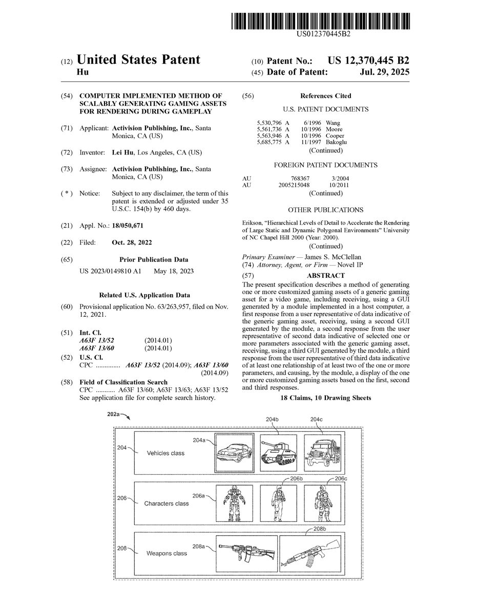 U.S. Pat. No. 12,370,445 U.S. Pat. App. No. 18/050,671 Computer Implemented Method of Scalably Generating Gaming Assets for Rendering During Gameplay Activision Publishing Inc October 28, 2022