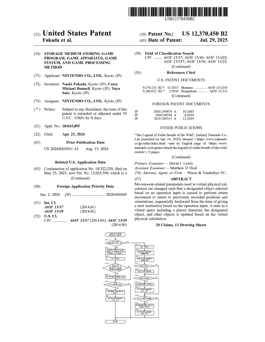 U.S. Pat. No. 12,370,450 U.S. Pat. App. No. 18/643,895 STORAGE MEDIUM STORING GAME PROGRAM, GAME APPARATUS, GAME SYSTEM, AND GAME PROCESSING METHOD NINTENDO CO., LTD. April 23, 2024