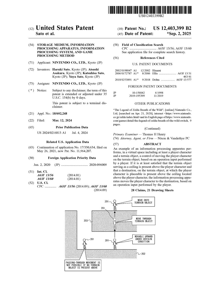 U.S. Pat. No. 12,403,399 U.S. Pat. App. No. 18/602,248 STORAGE MEDIUM, INFORMATION PROCESSING APPARATUS, INFORMATION PROCESSING SYSTEM, AND GAME PROCESSING METHOD NINTENDO CO., LTD. March 12, 2024