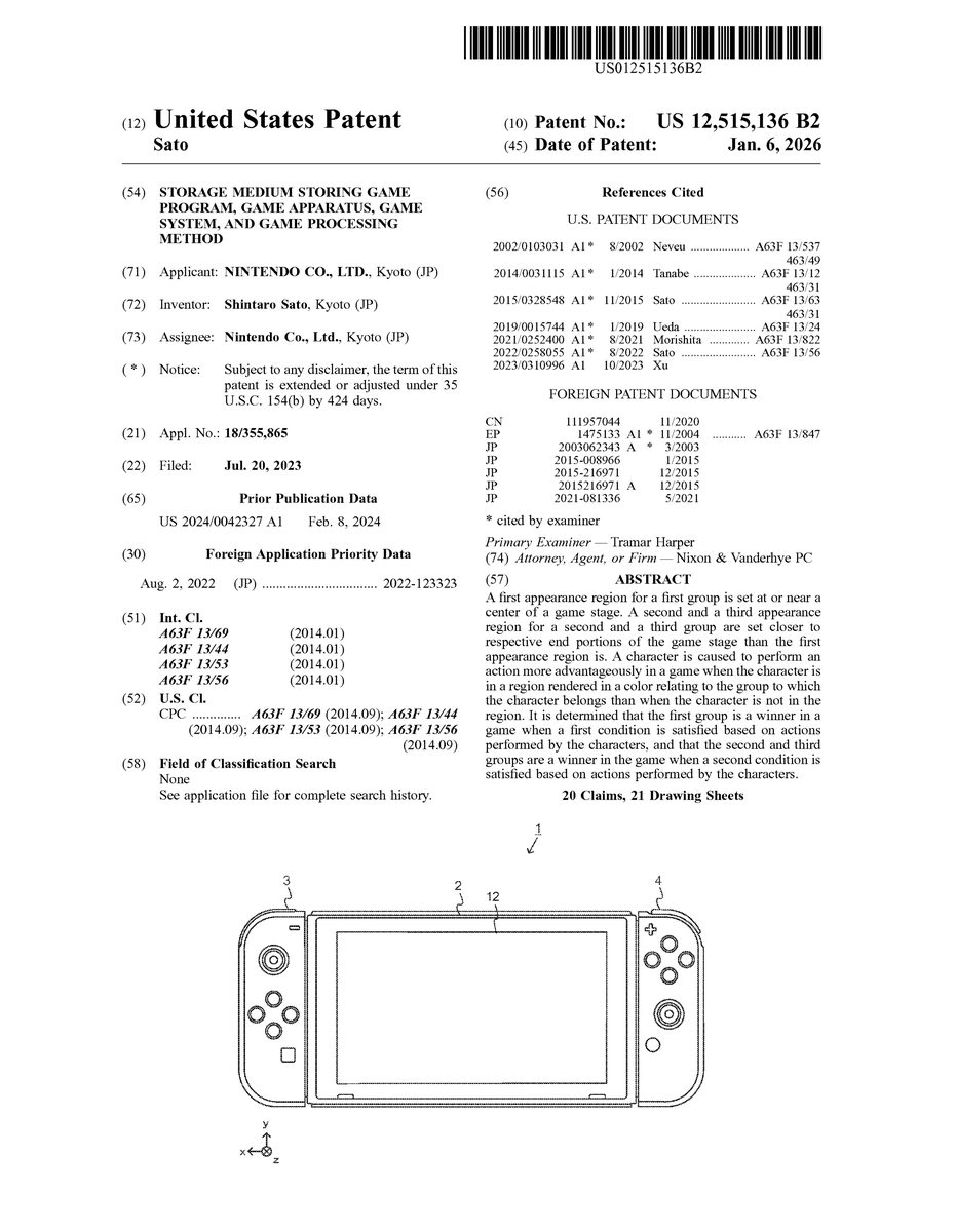U.S. Pat. No. 12,515,136 U.S. Pat. App. No. 18/355,865 STORAGE MEDIUM STORING GAME PROGRAM, GAME APPARATUS, GAME SYSTEM, AND GAME PROCESSING METHOD Nintendo Co., Ltd. July 20, 2023