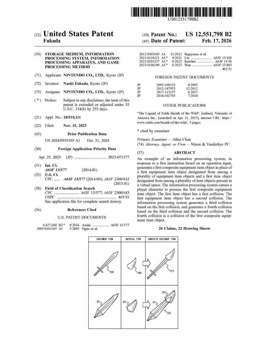 U.S. Pat. No. 12,551,798 U.S. Pat. App. No. 18/510,111 STORAGE MEDIUM, INFORMATION PROCESSING SYSTEM, INFORMATION PROCESSING APPARATUS, AND GAME PROCESSING METHOD NINTENDO CO., LTD. November 15, 2023