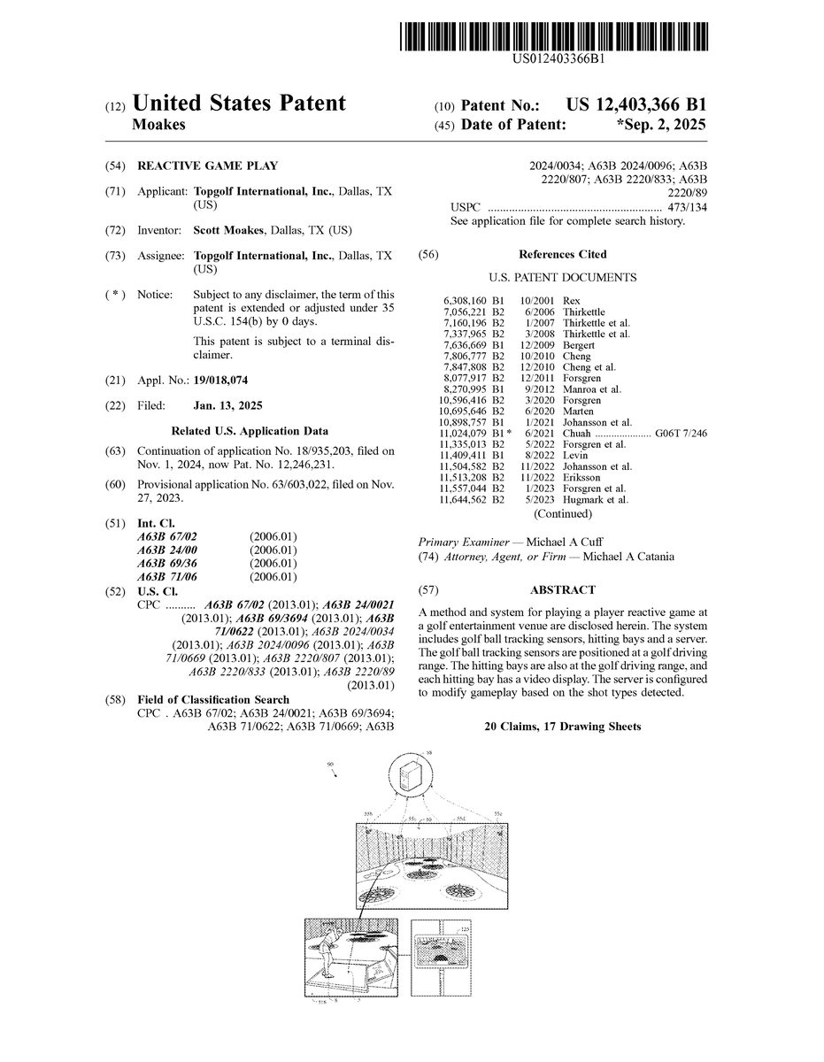 U.S. Pat. No. 12,403,366 U.S. Pat. App. No. 19/018,074 | Reactive Game Play | Topgolf International Inc | January 13, 2025 | Patent Details |