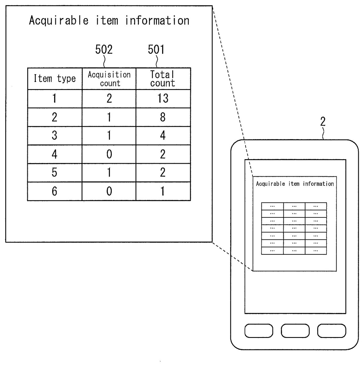 FIG. 5is an example of the acquirable item information that the information presentation unit12presents.FIG. 5illustrates an example of the acquirable item information presented when a request to present information is received from the communication terminal2and the user identification information pertaining to the communication terminal2is “UID1”. As illustrated inFIG. 5, information501on the total count and information502on the acquisition count of items for each item type are presented to the communication terminal2. The case of presenting the acquisition count has been described above, yet this example is not limiting. For example, a non-acquisition count may be presented by subtracting the acquisition count from the total count of items.