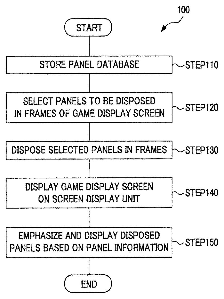DETAILED DESCRIPTION A game program according to examples will be described with reference to the accompanying diagrams. The game program is for a game in which the first and second characters battle against each other, and causes a computer to realize a data storage function, a panel selection function, a panel layout function, a screen display control function, and an emphasized display function. FIG. 1is a flowchart showing an example of a game program100. Using the data storage function, a first panel database including a plurality of panels that the first character possesses and a second panel database including a plurality of panels that the second character possesses are stored (STEP110). This function can be realized by a data storage unit to be described later. Using the panel selection function, panels to be disposed in frames of the game display screen including a battle display region formed by one or more frames are selected from the first panel database including a plurality of panels that the first character possesses and the second panel database including a plurality of panels that the second character possesses (STEP120). This function can be realized by a panel selection section to be described later. Using the panel layout function, the panels selected by the panel selection function are disposed in the frames (STEP130). This function can be realized by a panel layout section to be described later. Using the screen display control function, the game display screen is displayed on a screen display unit (STEP140). The screen display unit receives a signal output from a screen display control section of an information processing apparatus, which will be described later. For example, a display device provided in a user terminal can be used. In addition, it is possible to use a touch panel type display that ...