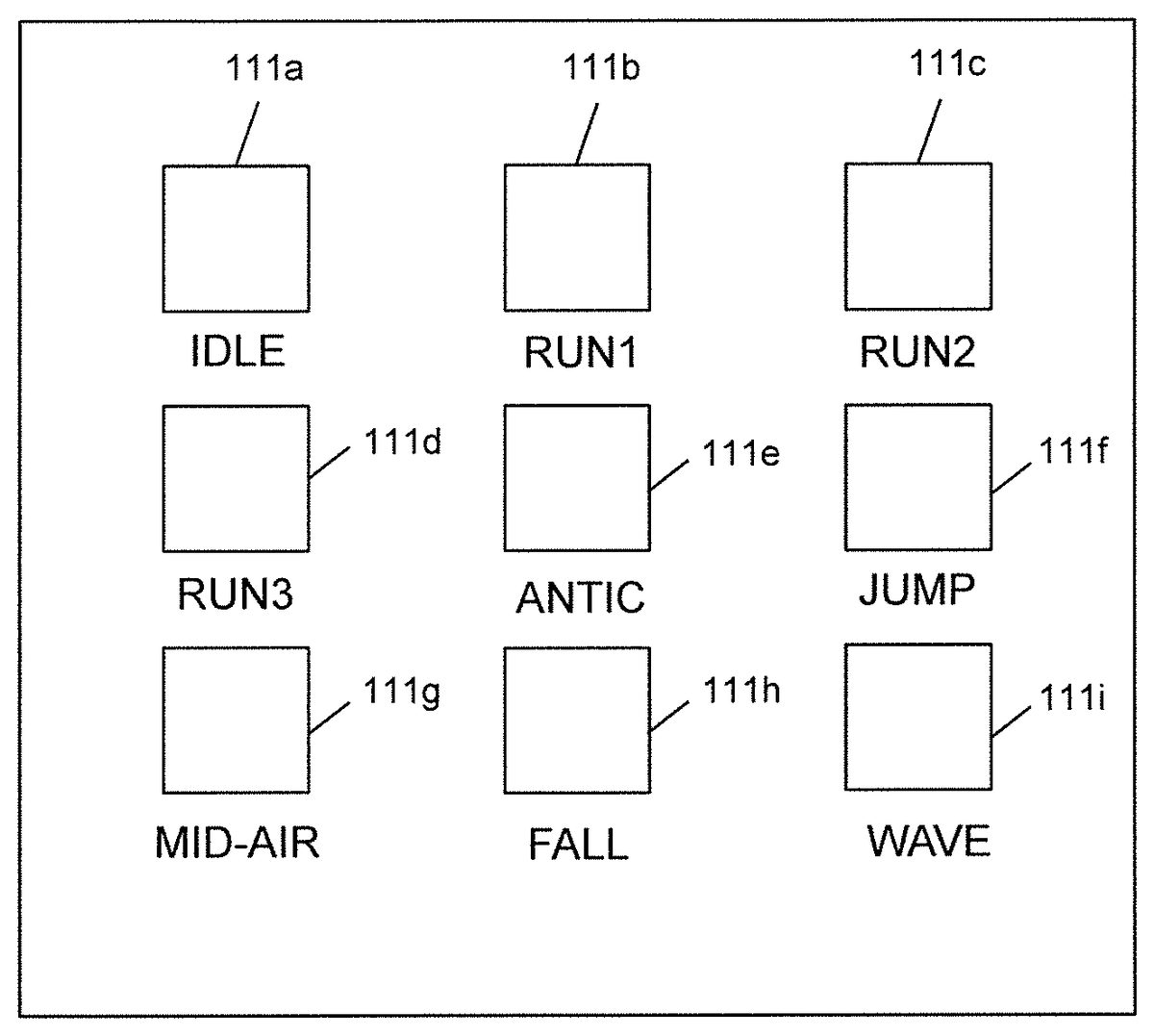 DETAILED DESCRIPTION FIG. 1illustrates a sheet including spaces for user definition of visual characteristics of a virtual character in a variety of postures, which may be considered poses. In many embodiments the sheet may be a sheet of paper. In some such embodiments the spaces for user definition may be outlined in the shape of boxes. In some such embodiments the spaces for user definition may be outlined in the shape of circles. In some such embodiments the spaces for user definition may be outlined in some other shape that clearly identifies to the user the space for user definition of visual characteristics of the virtual character in the variety of postures. In some embodiments the sheet may be in the form of a computer display of a graphical user interface (GUI), with the user able to operate the GUI so as to draw a virtual in various poses in various spaces within the GUI. In the embodiment ofFIG. 1, the sheet includes nine boxes111a-i. The nine boxes are arranged in a grid, with 3 boxes per row and 3 boxes per columns, but in various embodiments the sheet may include different numbers of boxes and the boxes may be otherwise arranged. Each of the boxes includes a label, for example a first box111ais labeled “IDLE”, a second box111bis labeled “RUN1”, a third box111cis labeled “RUN2”, and a fourth box111dis labeled “RUN3”. As may be seen from the example of the labels for boxes111b-d, a plurality of boxes for related poses may be provided, for example poses pertaining to a single activity of the virtual character. The user is to draw or otherwise enter a representation of the virtual character in each of the boxes. For example, the user may draw a representation of the virtual character in an idle ...