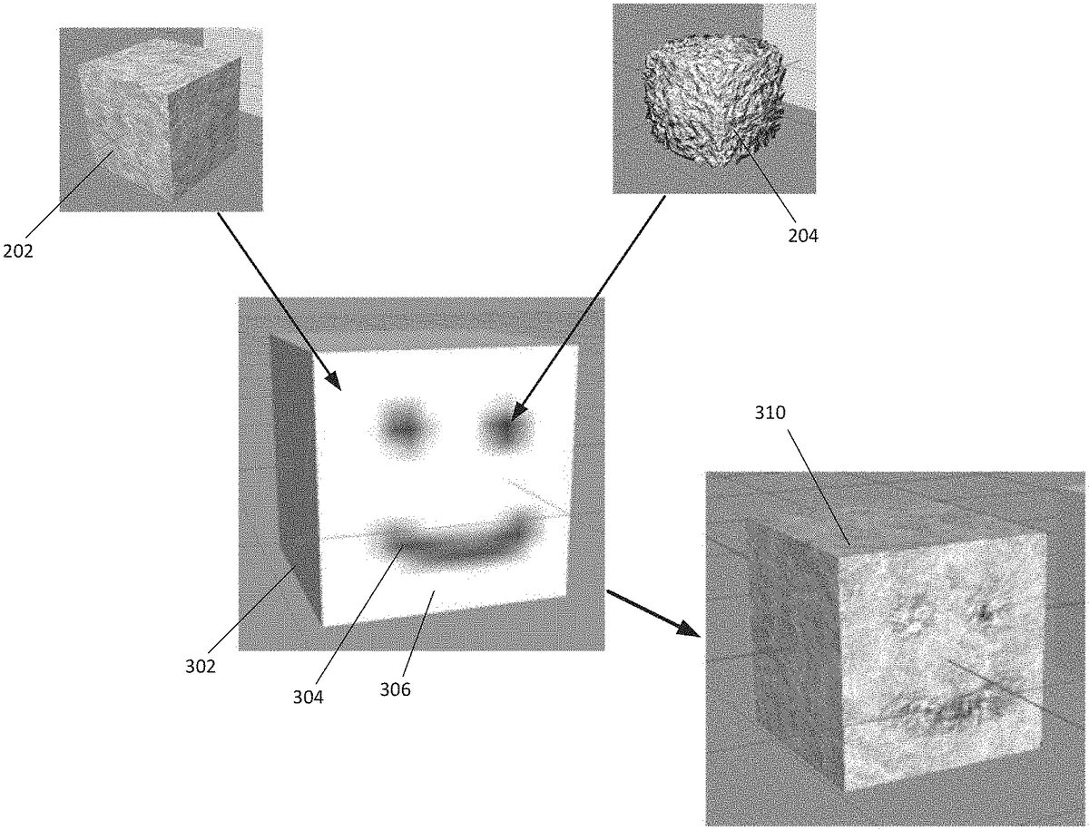 FIG. 3illustrates embodiments of multiple versions of a particular object type that may be blended to form a rendered texture for an instance of the object within a game environment. Each instance of the object in the game environment can be mapped to a unique portion of the megatexture for the object. The megatexture can also be referred to as a blend map302. The blend map302may be used to blend multiple versions of the object (for example, the version of the object202and the version of the object204), in order to generate instances of the object with varying display characteristics (for example, different degrees of change) within the game environment.