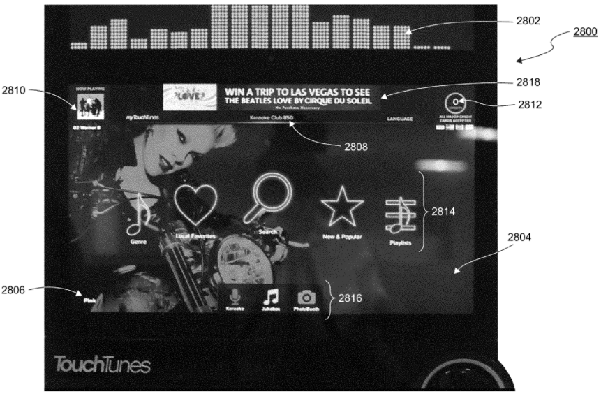 The ‘132 patent also allows users to set up accounts with photo avatars for the device’s pay-for-play karaoke with certain social media accounts. The display can be configured to display a performer identifier screen which identifies the user who selected the song in the pay-for-play karaoke mode. This can be determined automatically if a user logs into a jukebox device. The avatar can be retrieved from the social media account or taken with a camera connected to the device.
