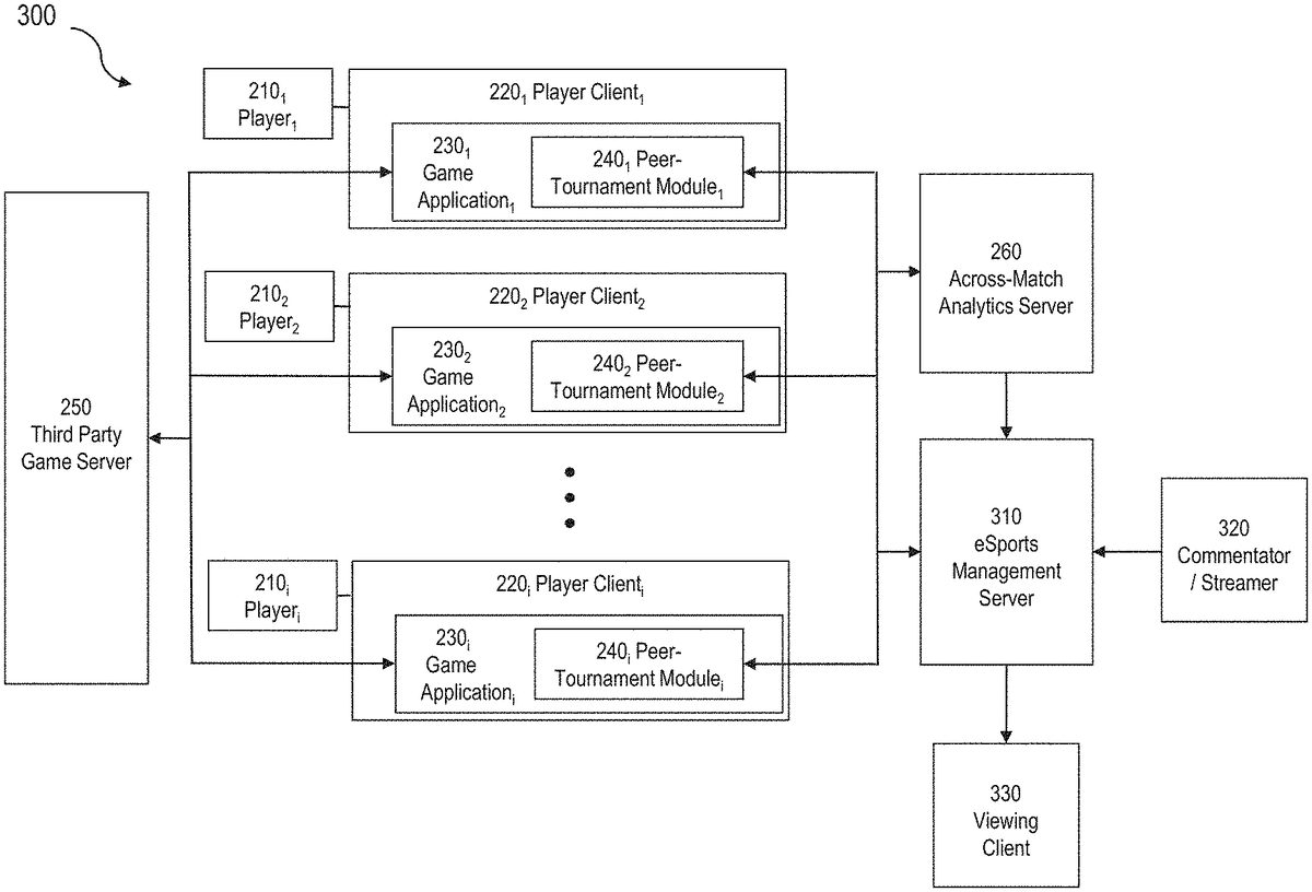FIG. 3is a system block diagram of a system300with an example eSports Management system310utilizing cross-match analytics to provide automatic recommendations for which portions of video to stream of an online eSports tournament. The example system300includes the components as described above with reference toFIG. 2and further includes an eSports management server310. ESports management server310interfaces with a tournament commentator320, which can be the tournament host, participant, or third party (also referred to as a streamer320). ESports management server310can provide an automated virtual broadcast studio for tournament commentator320to cover an eSports tournament. eSports management server310receives the cross-match comparison from the across-match analytics server260and can automatically break down video into highlight reels and key segments, provide the game analytics to viewing clients330and/or players210, and assemble a suggested broadcast for the tournament commentator320. eSports management server310can broadcast a live video feed (as controlled by tournament commentator320) to players210, and/or viewing clients330.