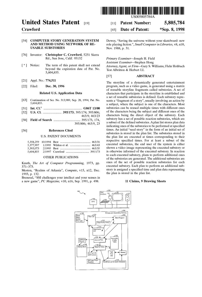 U.S. Patent No. 5,805,784: Computer story generation system and method using network of re-usable substories
