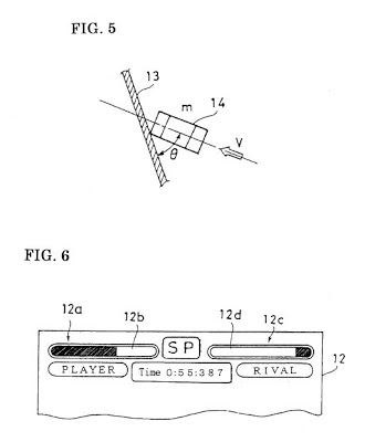 In this case, the force of collision in a direction perpendicular to a wall or car collided with is calculated at prescribed periods. A value proportional to this collision force is subtracted from the points SP. As described above, the prescribed period is one frame ({fraction (1/60)} seconds) of images displayed on the TV monitor 102 . In the example shown in FIG. 5 , a car 14 having a mass m (kg) and traveling at a velocity v (m/s) collides with a wall 13 (or another car) while moving at an angle thereto. The force of collision in this case is calculated at each frame according to Equation (1) below.