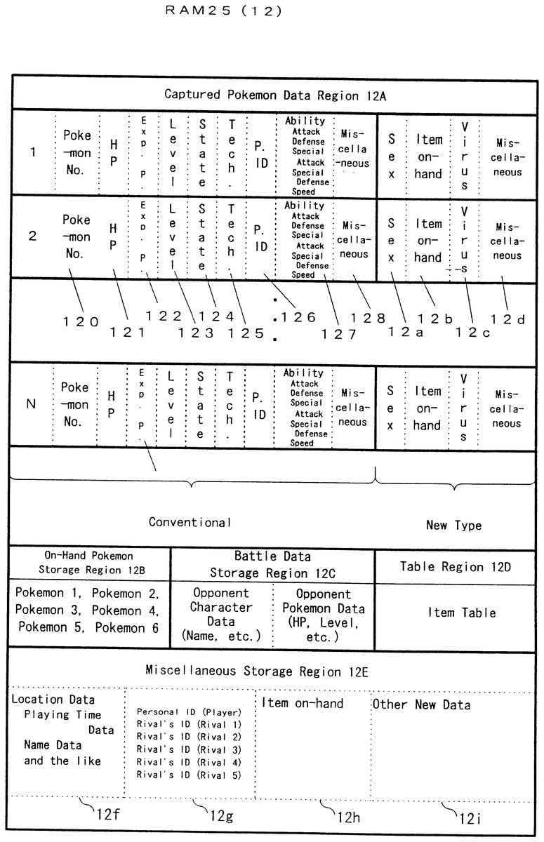 The RAM 12 has a region for storing property data varied in type respectively for the characters captured in the course of the game. Such storage region on the RAM 12 includes, as shown in FIG. 4 , a captured pokemon data region 12 A for storing any captured (or obtained) pokemon, an on-hand pokemon storage region 12 B, a battle data storage region 12 C, a table region 12 D, and a miscellaneous storage region 12 E.