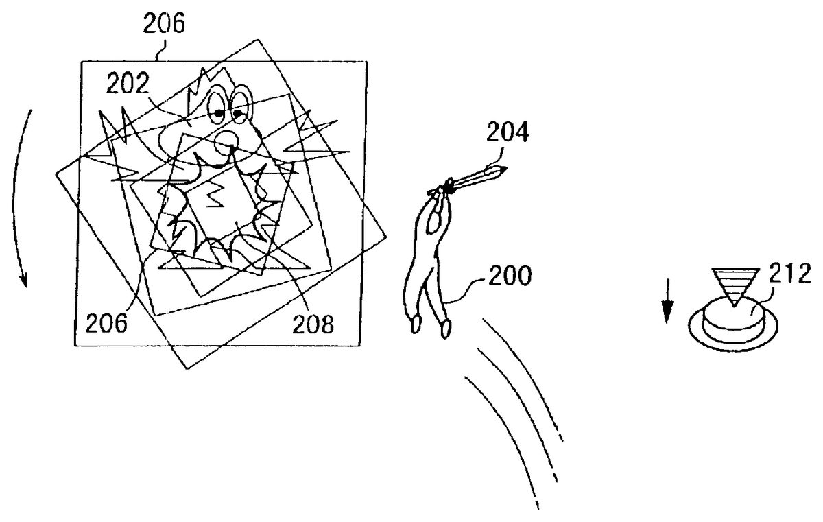 The ‘149 patent describes a method used in video games where the main character can easily identify and target enemy characters. The invention calls for a rectangular navigation mark which is displayed over a designated monster on the screen. Whenever the main character approaches the enemy, the navigation mark signals that the player is close and begins emitting a light which draws the player’s attention to it. This invention should make the game easier by assisting the player in finding enemies to battle. Once the player has located the enemy he can then target the enemy and press buttons which will correspondingly produce an attack on the enemy.