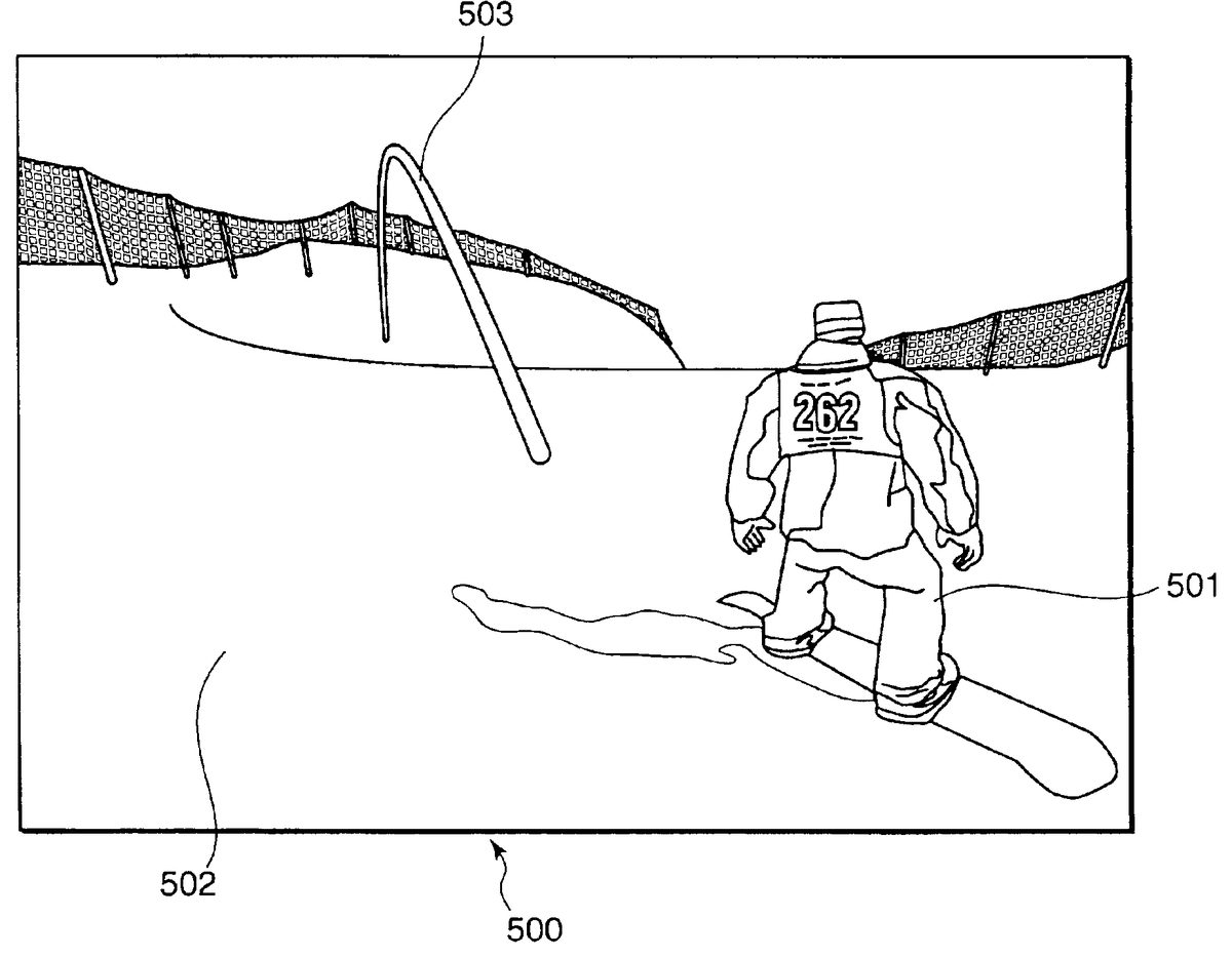 However, since, as shown inFIG. 4, rail503is narrow, the above positional alignment operation is difficult. Also, in this case, the camera viewpoint is in a position about 45° from the opposite side of the direction of advance of snowboarder501so snowboarder501is displayed on screen500in such a way as to be moving diagonally upwards in the screen; thus, the aforesaid positional alignment operation is made even more difficult.