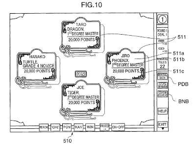 Displayed in each of the general personal information screen530, the winning hand distribution screen540, the game record screen550and the dragon chips screen560are a personal data button PDB that is located in roughly the center of the right edge of the screen and is pressed in order to display the player's personal information, a counter confirmation button BNB that is located below the personal data button PDB and is pressed in order to display the number of counters possessed by all four game competitors including the player, a total information button TIB that is located to the left of the personal data button PDB and is pressed in order to display the general personal information screen, which is a screen that comprehensively presents personal information regarding the player, a winning hand distribution button RDB that is pressed in order to display the winning hand distribution screen, which is a screen that indicates the distribution of the player's winning hands, a game record button FRB that is pressed in order to display the game record screen, which is a screen that indicates the results attained by the player in past games, a dragon chips button HDB that is pressed in order to display the dragon chips screen, which is a screen that indicates the number of dragon chips and the like possessed by the player, and a ‘Back’ button BB that is pressed in order to return to the original screen.