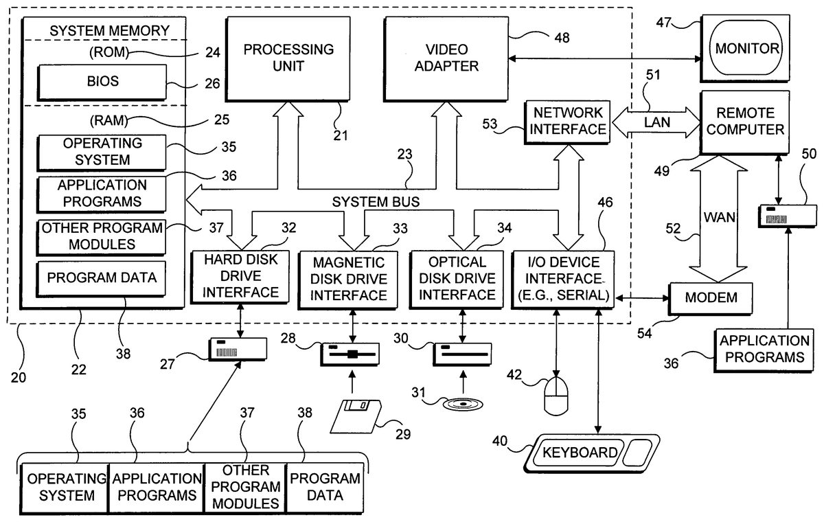 A number of program modules may be stored on the hard disk, magnetic disk29, optical disk31, ROM24, or RAM25, including an operating system35, one or more application programs36, other program modules37, and program data38. A user may enter commands and information into PC20, and provide control input through input devices such as a keyboard40and a pointing device42. Pointing device42may include a mouse, stylus, wireless remote control, or other pointer. As used herein, the term “mouse” is intended to encompass virtually any pointing device that is useful for controlling the position of a cursor on the screen. Other input devices (not shown) may include a microphone, joystick, haptic joystick, yoke, foot pedals, game pad, satellite dish, scanner, or the like. These and other input/output (I/O) devices are often connected to processing unit21through an I/O interface46that is coupled to the system bus23. The term I/O interface is intended to encompass each interface specifically used for a serial port, a parallel port, a game port, a keyboard port, and/or a universal serial bus (USB). A monitor47or other type of display device is also connected to system bus23via an appropriate interface, such as a video adapter48. In addition to the monitor, PCs are often coupled to other peripheral output devices (not shown), such as speakers (through a sound card or other audio interface—not shown) and printers.