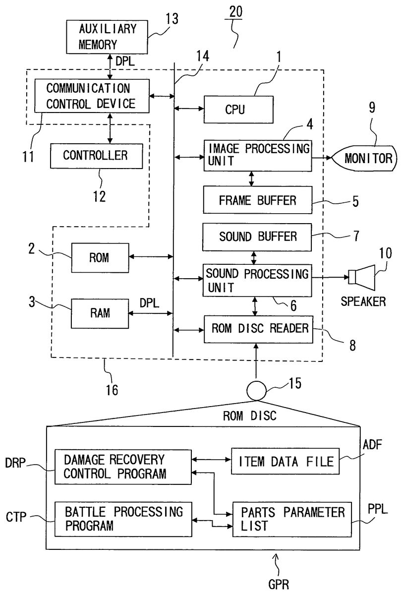 In the game machine20, the CPU1firstly executes a predetermined initialization process according to the program of the ROM2after a predetermined initialization operation (the operation of turning the power on, for instance). When the initialization finishes, the CPU1starts to read the game program GPR which is stored in the ROM disc15, and starts game processing according to the program. When a player executes a predetermined game start operation on the controller12, the CPU1starts various processing necessary for the execution of the game according to the routines of the game program GPR on the basis of the instruction.