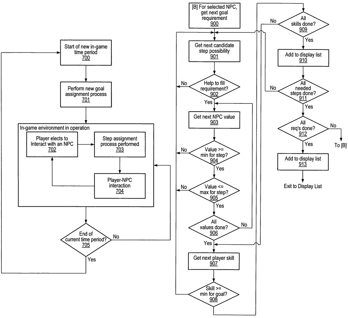 The ‘806 patent provides a system where NPC (non-playing characters) can be programmed with different “goals’ during an MMOG game. A user can have his avatar approach a NPC and interact with him. Under this invention, the NPC will have a different interaction with the player each time depending on the internal time and past decisions the player has made. For example, at one point the NPC may need the player’s help setting a trap for a bear, when the next time he needs help with his campaign for mayor. By programming several options into the NPC, the invention attempts to make sure that the user’s past choices in the game matter and affect the game play.