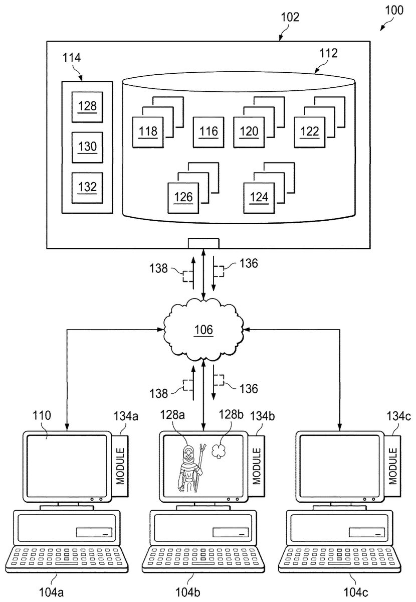 The GUI110comprises a graphical user interface operable to allow the user of the client104to interface with at least a portion of system100for any suitable purpose, such as viewing a virtual world in real time. Generally, the GUI110provides the particular user with an efficient and user-friendly presentation of data provided by or communicated within system100. The GUI110may comprise a plurality of customizable frames or views having interactive fields, pull-down lists, and buttons operated by the user. The GUI110can be configurable, supporting a combination of graphical elements, to present the Web pages118including the graphical elements128. The term graphical user interface may be used in the singular or in the plural to describe one or more graphical user interfaces and each of the displays of a particular graphical user interface. The GUI110may be any graphical user interface, such as a generic web browser or touch screen, that processes information in the system100and efficiently presents the results to the user. The server102can accept data from the client104via a client application or web browser (e.g., Microsoft Internet Explorer or Netscape Navigator) and return the appropriate HTML, XML, and/or other responses to the browser using the network106, such as the graphical elements128.