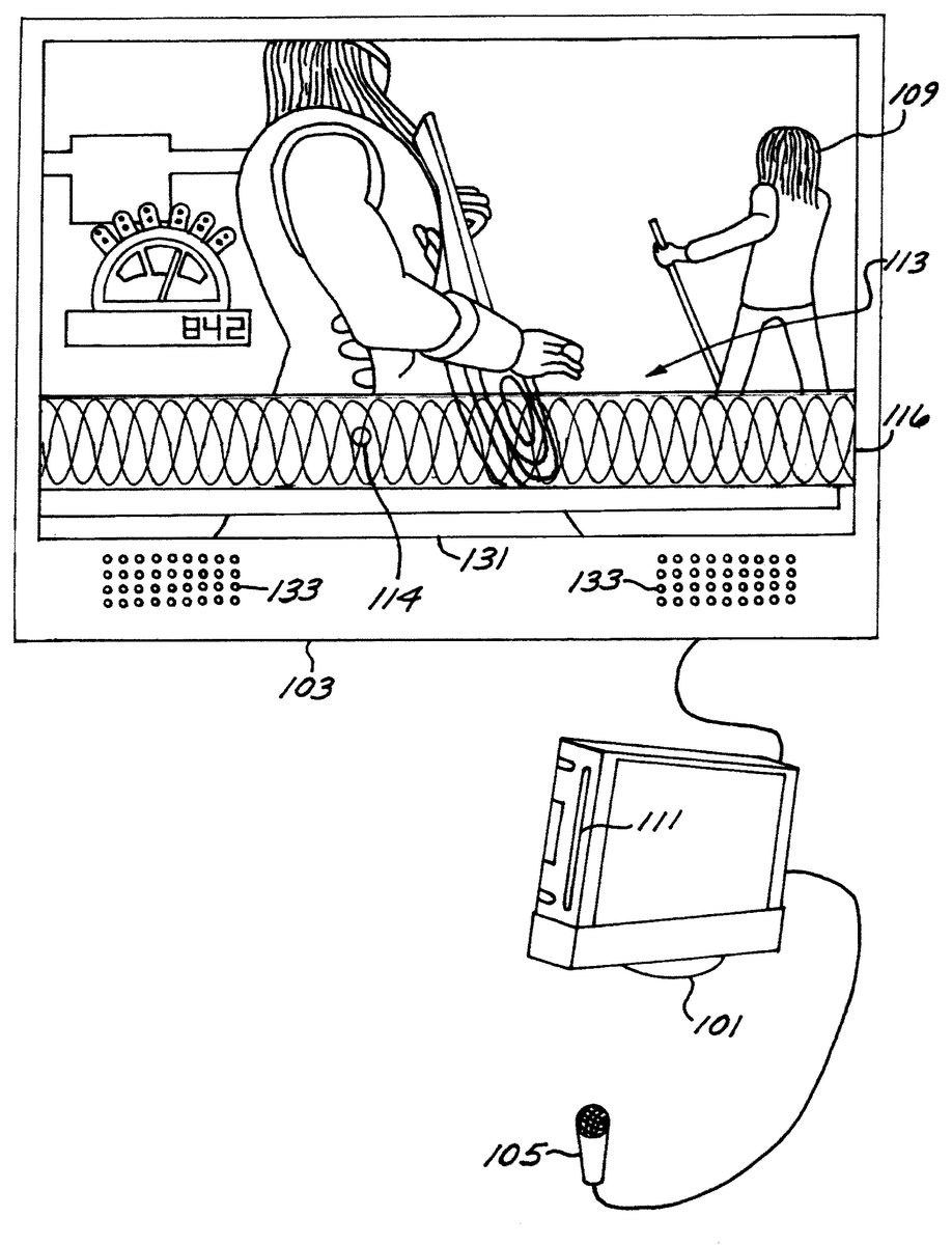 DETAILED DESCRIPTION FIG. 1is an example of a video game system in accordance with aspects of the invention. The video game system includes a video game console101, a display103, and a microphone105. The video game console includes internal circuitry which allows the console to run a video game by executing various program instructions related to proper execution of the video game. The video game console typically includes one or more processors, memory, and various interface circuitry for running a video game. The instructions for each specific video game are generally found on a removable memory source such as a video game CD-ROM, inserted into a removable memory interface111of the video game console. In some embodiments of the invention, the video game console may alternatively be a handheld gaming device, including similar internal circuitry as herein described, as well as, for example, a built in display or displays and various different game player input devices, or in some embodiments a computer, for example a personal computer, may be used. The video game console is coupled to the microphone by a wired connection, although it should be recognized that in many embodiments the microphone and video game console include wireless communication capability, and information from the microphone or between the microphone and video game console may be transferred by way of wireless communications. In addition, in various embodiments input devices other than microphones may instead or additionally be used, for example guitar shaped controllers, drum controllers, joystick controllers or other similar game controllers. The video game console is also in communication with a display unit103, generally through an audio-video cable or similar wired connection, although a wireless connection may be used in some embodiments. The display unit is typically a television, although in some embodiments a monitor may be used, with a ...