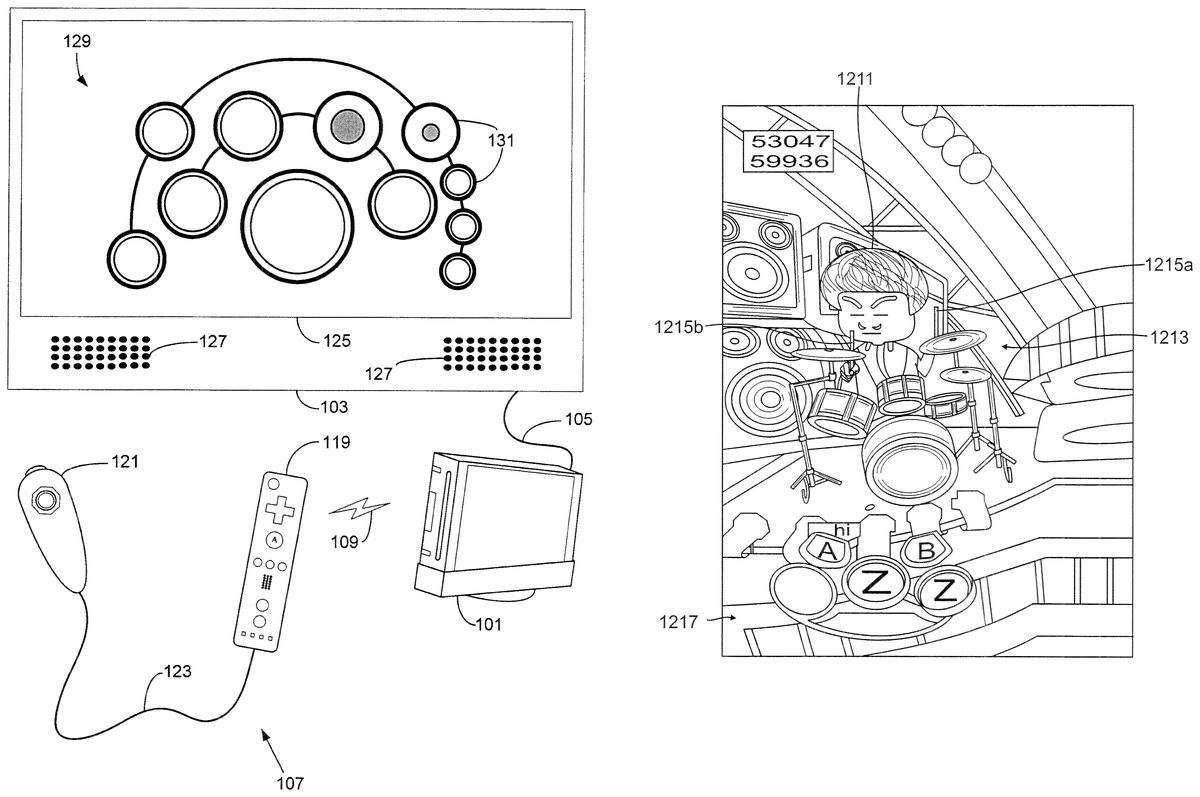 U.S. Patent No. 8,858,330 (the ‘330 Patent) describes a music rhythm game that uses motions controls without any peripheral equipment. An excellent example of the ‘330 Patent is a game with virtual drums. The game represents the drums on the screen. To play the virtual drums, the user must do the correct controller inputs, which could include motions. A person using the Nintendo Wii might have to swing the Wiimote down for the system to register an input. A drum sound will be played on the television once the system logs the input. The ‘330 Patent is not limited to just motion controls; a player can use traditional controller inputs as well.