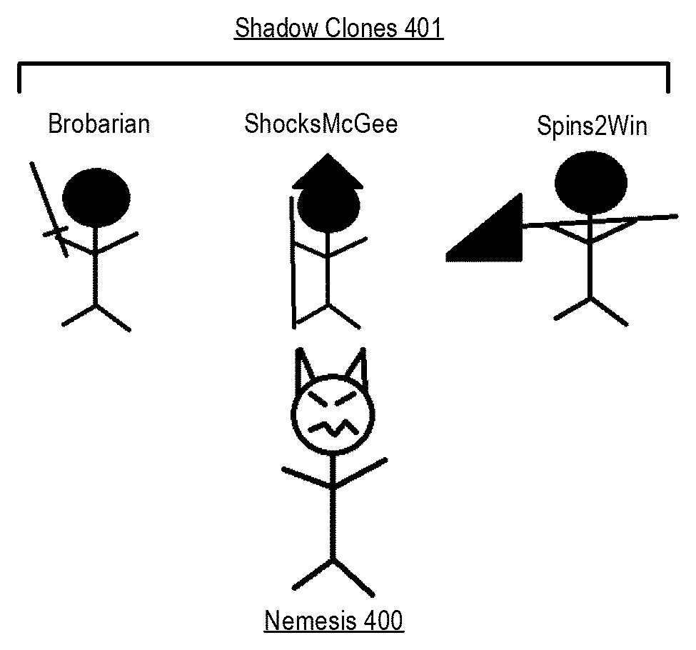 FIG. 4illustrates a depiction of the nemesis and a number of shadow clone henchman according to an embodiment. InFIG. 4, the nemesis400is generated in the vicinity of loyal shadow clones401representing the players that the nemesis had previously defeated. In this particular case, the nemesis400had defeated three previous players. As depicted, the appearance and name of the shadow clones401are based on the players that the nemesis400had defeated. For example, the player character corresponding to the shadow clone “ShocksMcGee” may have belonged to the “wizard” character archetype within the game. As a result, the corresponding shadow clone uses a model that depicts a wizard hat and staff. Similarly, the player character corresponding to the shadow clone “Spins2win” may be specialized in halberd-wielding skills and thus wields a halberd.