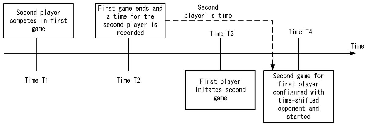 FIG. 2Bdepicts a timeline for the time-shifted multiplayer game according to one embodiment. As a time T1, the second player competes in the first game. Then, at a time T2, the first game ends and a time for the second player is recorded. At a time T3, the first player initiates the second game. The second game is started after the completion of the first game as is shown. At time T4, the second game is configured with a time-shifted opponent using the first player's time and the game is started. As shown, the first and second games are not played at the same time, but the second game simulates a multiplayer game using the second player's time.